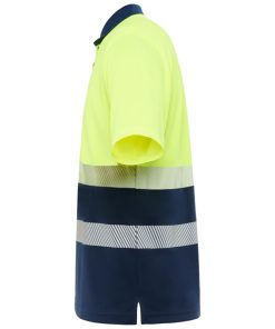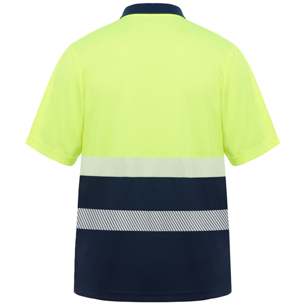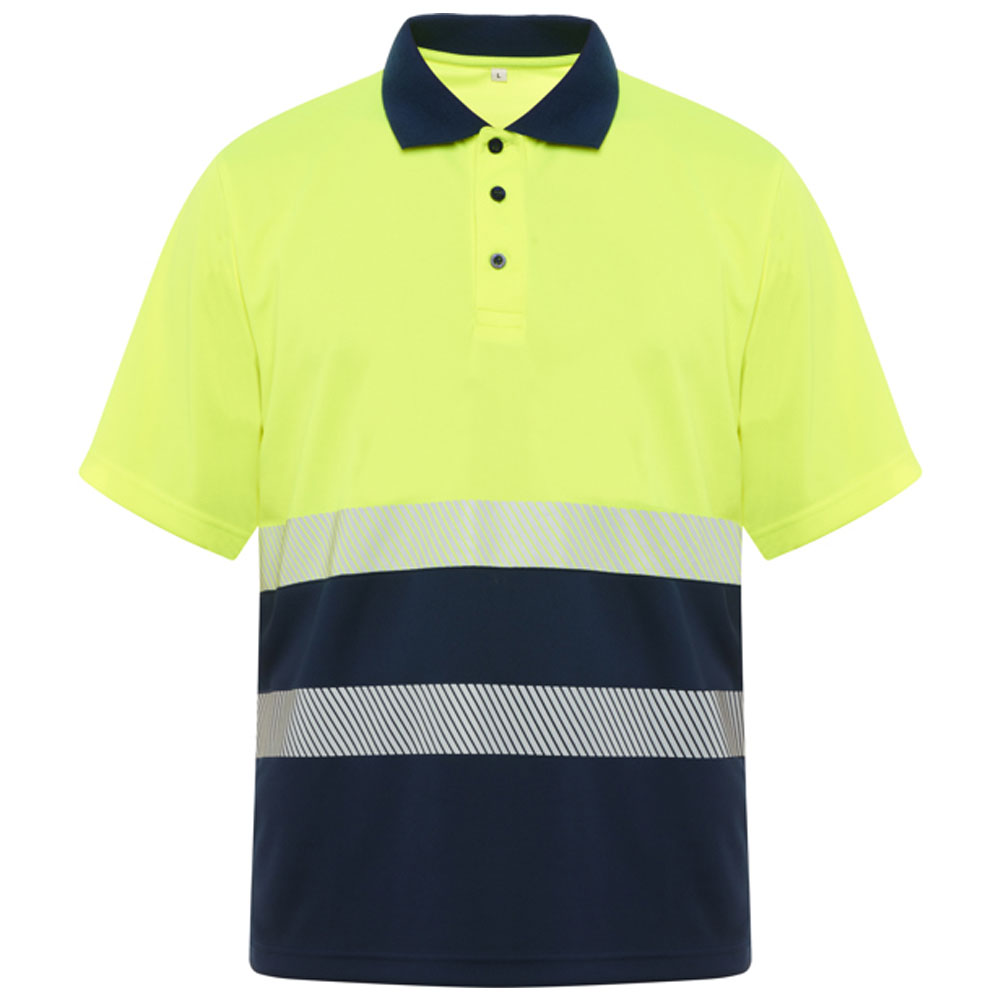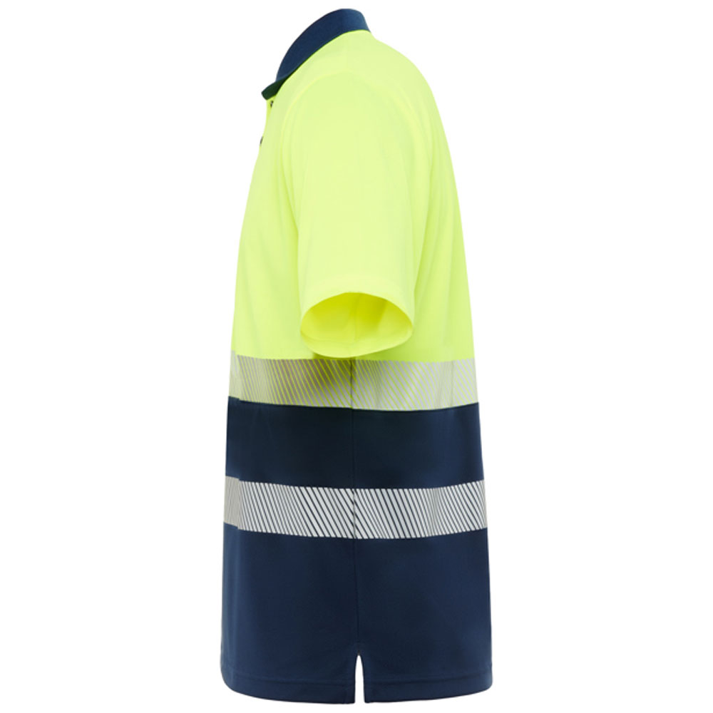 Polo técnico de alta visibilidad en manga corta. · Cuello en punto canalé 1×1 · Dos cintas reflectantes segmentadas en pecho y espalda. · Tapeta con 3 botones a contraste. · Tejido anti enganches y fácil secado. · 100 % polyester bird´s eye, 170 g/m².
